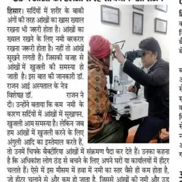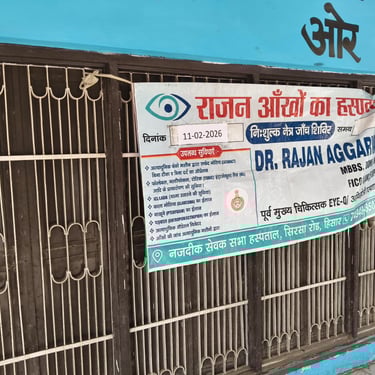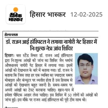 राजन आँखों का अस्पताल द्वारा दिनांक 11-02-2026 को एक विशेष नि:शुल्क नेत्र जांच शिविर का आयोजन किया गया, जिसमें क्षेत्र के अनेक लोगों ने भाग लेकर अपनी आंखों की जांच करवाई। शिविर स्थल पर अस्पताल की विशेषज्ञ टीम द्वारा दृष्टि परीक्षण, मोतियाबिंद जांच, आंखों की एलर्जी, पानी आना, जलन एवं धुंधलेपन जैसी समस्याओं की विस्तृत जांच की गई।