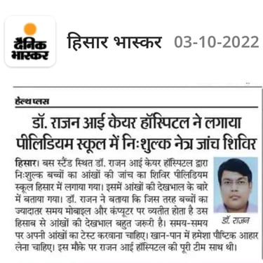 डॉ. राजन आई हॉस्पिटल, हिसार द्वारा समय-समय पर शहर के विभिन्न सामाजिक, शैक्षणिक एवं संस्थागत स्थलों पर नि:शुल्क नेत्र जांच शिविरों का आयोजन किया जाता है। इन शिविरों में बड़ी संख्या में लोगों ने अपनी आंखों की जांच करवाई तथा अनुभवी विशेषज्ञों से परामर्श प्राप्त किया।